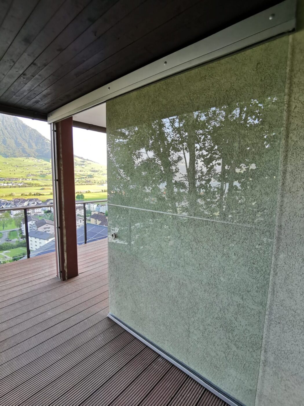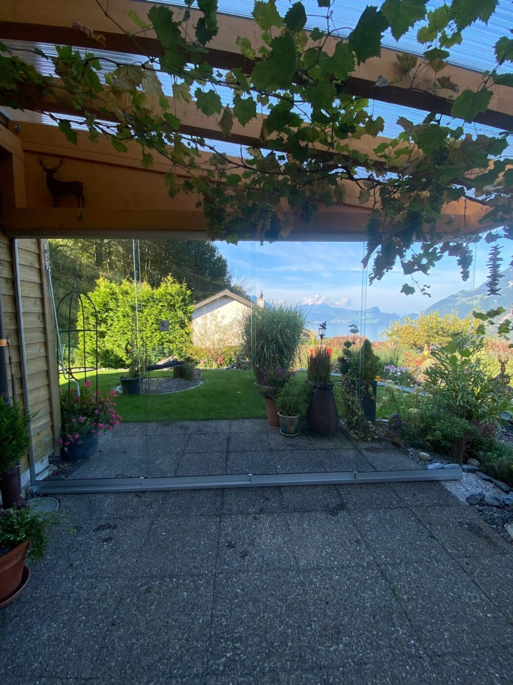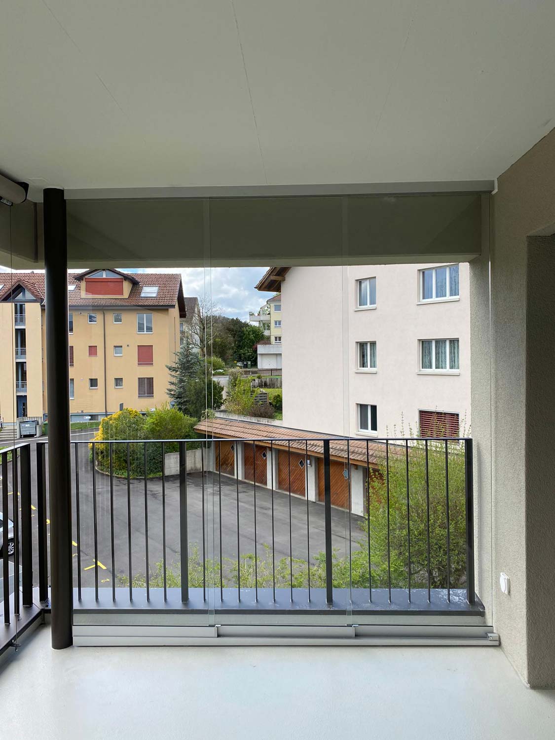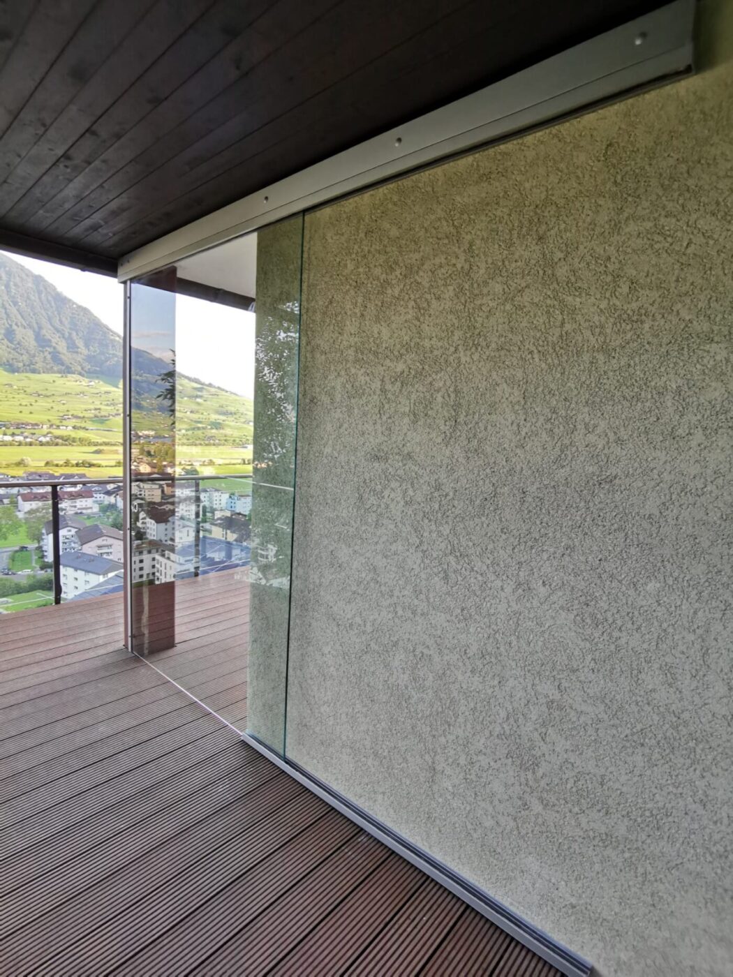 Die Einfachrolle verschwindet beim Schliessen der Glasflügel in der zum laufschienenprofil flächenbündigen Ausfahrt.